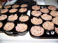 Preheat oven to 450. Chop beans and tomatoes in a food processor until they are small chunks (or mash with a fork). Combine all ingredients (except for ketchup and barbecue sauce) well in a bowl. Spray muffin pans with cooking spray, or use muffin liners (which would probably also be best sprayed). Scoop meat and veggie mixture into muffin cups and fill to the top. Squirt a small amount of ketchup and a small amount of barbecue sauce on top of each muffin, and spread out evenly.
