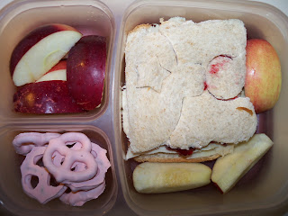 Her lunch is a Lunch Punched leftover sandwich (cranberry sauce, turkey, stuffing, and I added some cheddar to this one), along with apple slices. Her sandwich didn't come out super well, and I got some cranberry sauce on it, but it's the cute princess on a throne one... I'm getting better at using The Lunch Punch, but I'm not an expert yet.
