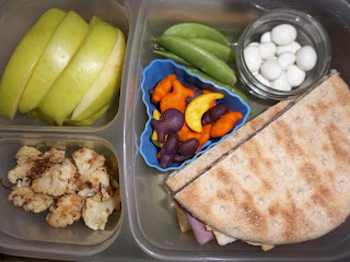Her lunch is some roasted cauliflower, two cutie clementines, a ham & cheese sandwich on flat bread, goldfish crackers, sugar snap peas, and some yogurt raisins.