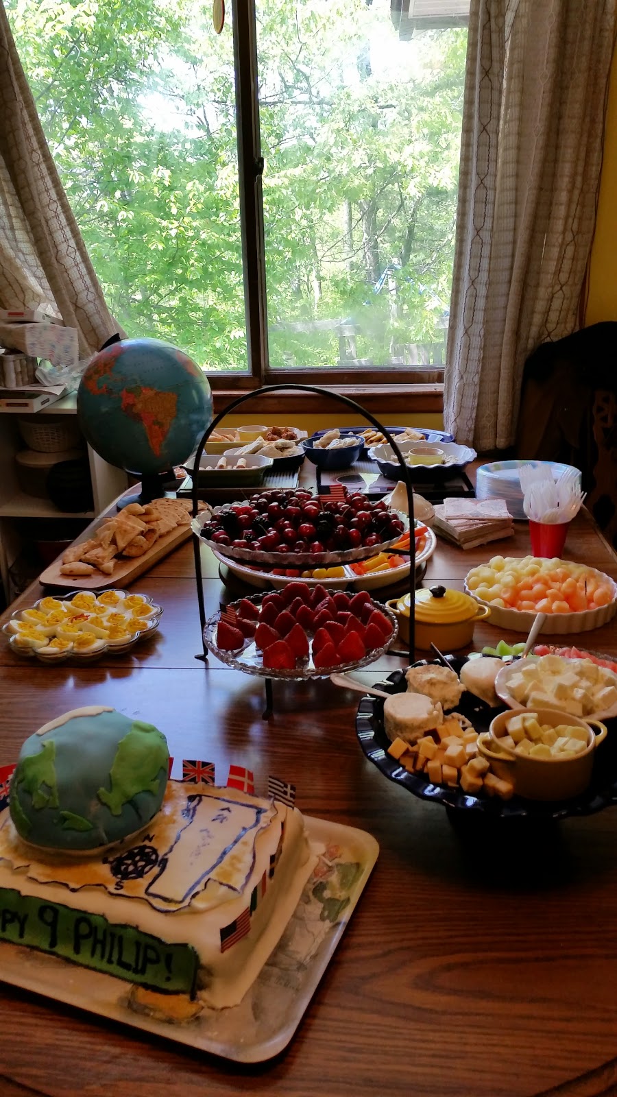 For food, we went simple, with frozen International appetizers, cooked up easily, and fruit and vegetable platters, so that I could focus my attention on the cake.